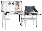 We go RVing a lot during the summer, and my husband likes to do the cooking. I've gotten him quite a few Coleman camp kitchen items, and this was to replace the original Coleman kitchen we bought 3 years ago. That kitchen had the accordion-folding base, with rather rickety legs that were breaking. This kitchen, however, is awesome! Good sturdy legs. A great stainless steel look. Our Road Trip grill fits great on the lower platform, with the extra grill plates on the shelf below, and we loved the little sink, although we didn't use it to wash dishes. The spice rack is also a great feature. The only thing missing is a place to hang a lantern, but other than that, it seems that Coleman did try to think of everything when they made this sturdy item. It even comes in its own canvas bag, which my husband loved when it came time to pack the kitchen away in the trailer.